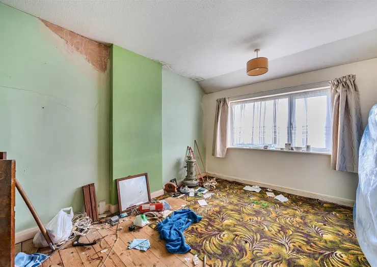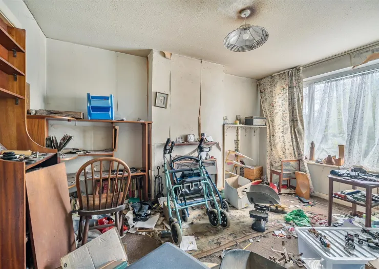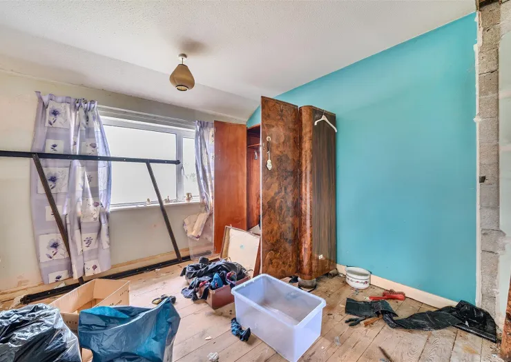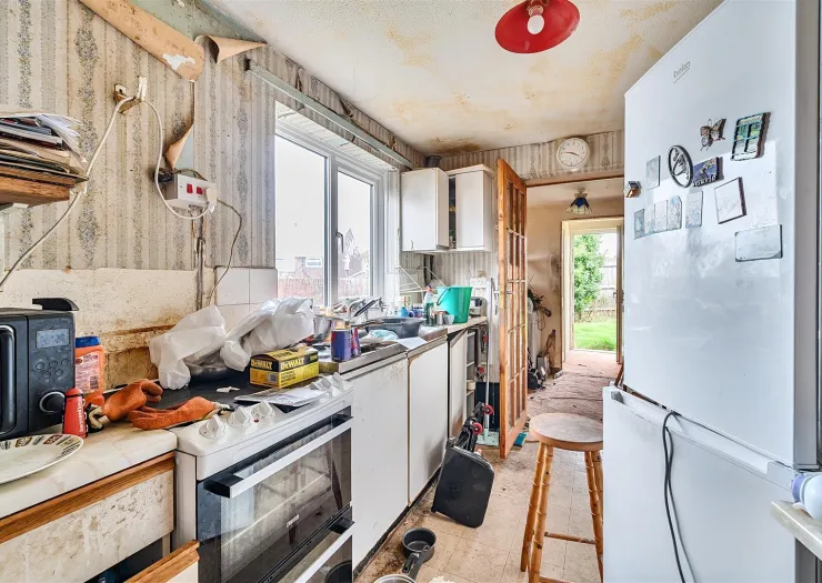 A three bedroom semi-detached house for refurbishment. Quite a project but the property has the making of a pleasant and desirable three bedroomed home with garage and gardens.