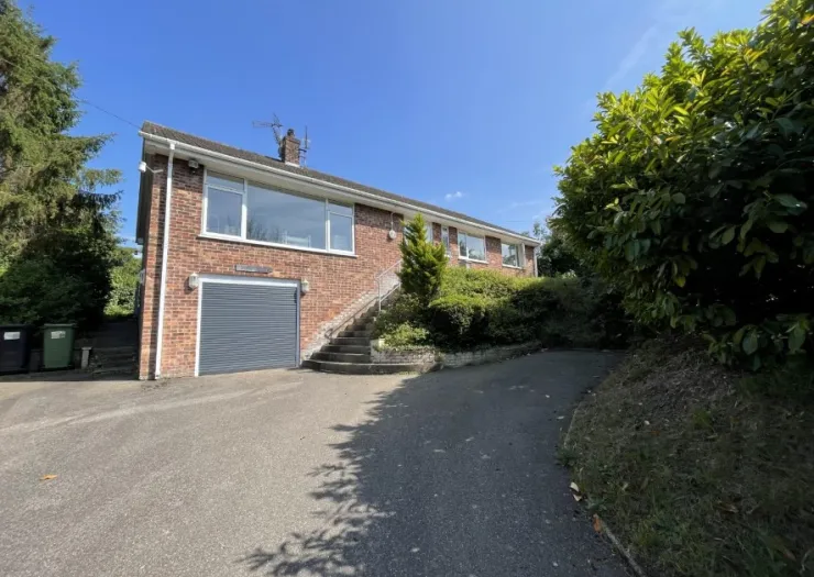 Elevated individual four bedroom detached bungalow in need of modernising, offering great potential for adaption. The bungalow is elevated at the front with garage and workshop beneath and steps lead to the front entrance and rear garden.