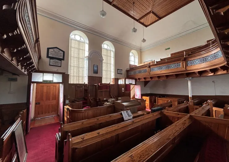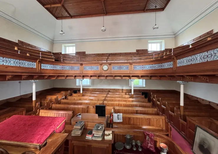 This former Grade II listed chapel appears to be of solid stone elevations with softwood window frames with 2 storied design, double entrance way and two internal staircases. The site is restricted with no external curtilage other than for the tarmacadam raised forecourt with wrought iron railings. Inside are two lobby areas with a central raised pulpit and fitted box pews in pine.